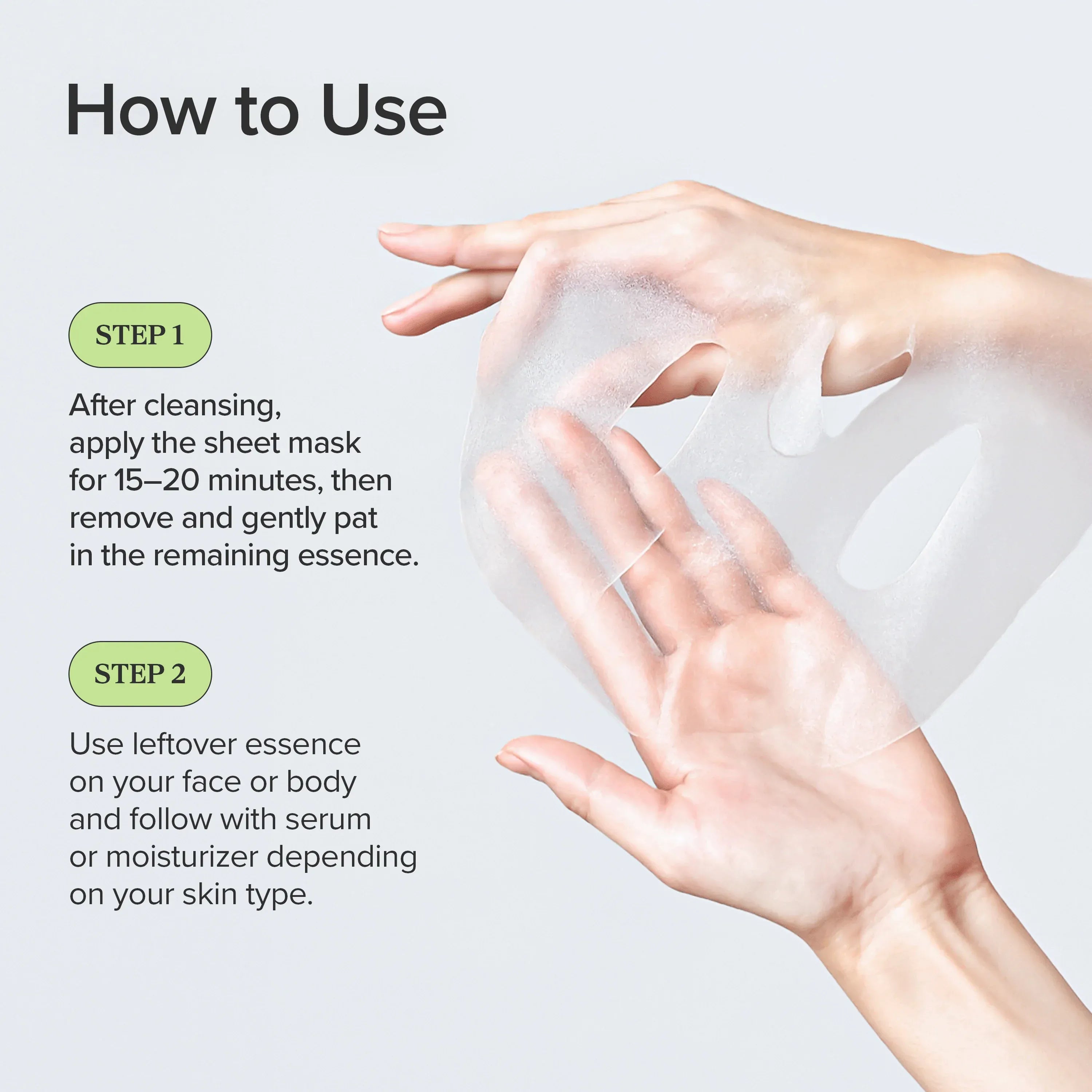 After cleansing, apply the sheet mask for 15–20 minutes, then remove and gently pat in the remaining essence. Use leftover essence on your face or body, and follow with serum or moisturizer depending on your skin type.
